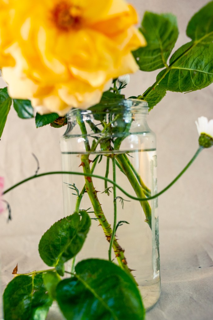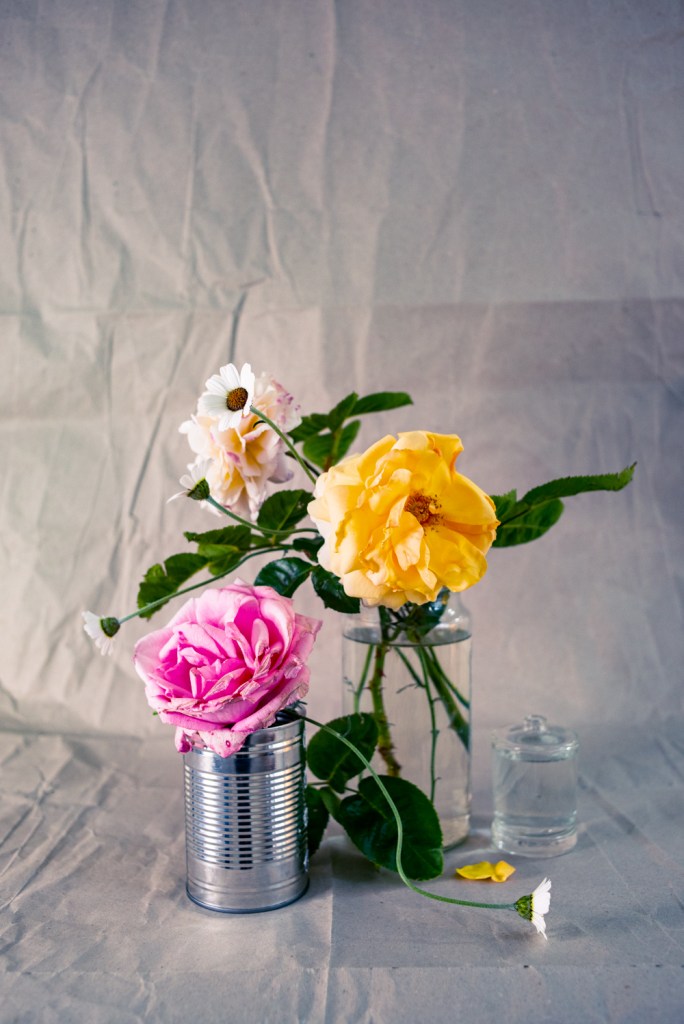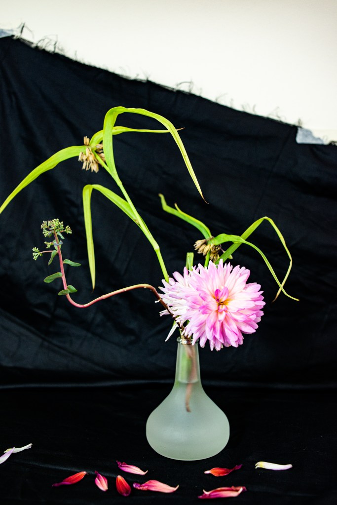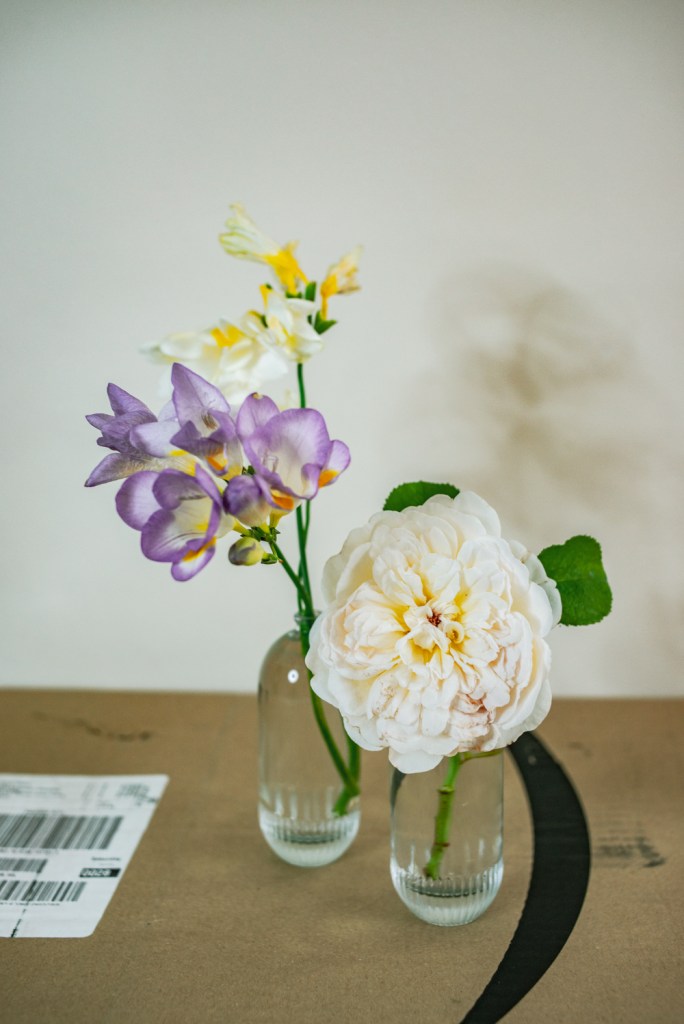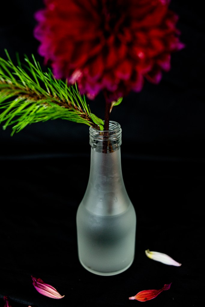 I never took up floral arrangement lesson, so I composed everything on the go. I used upcycled sake bottles, coffee and condiment jars as containers, and recycled Amazon wrapping paper as backdrop.