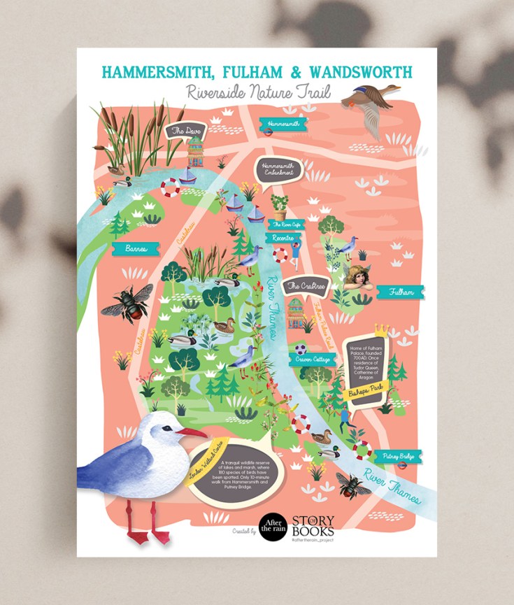 After The Rain created a Southwest London nature trail map to celebrate the HF ArtsFest event, “River to river, coast to coast”, which is taking place at Re:Centre in Hammersmith on 8 June 2019. The scenic Hammersmith Embankment location is a stone’s throw away from London’s foremost wildlife conservation area, the WWT London Wetland Centre in the London Borough of Richmond Upon Thames.